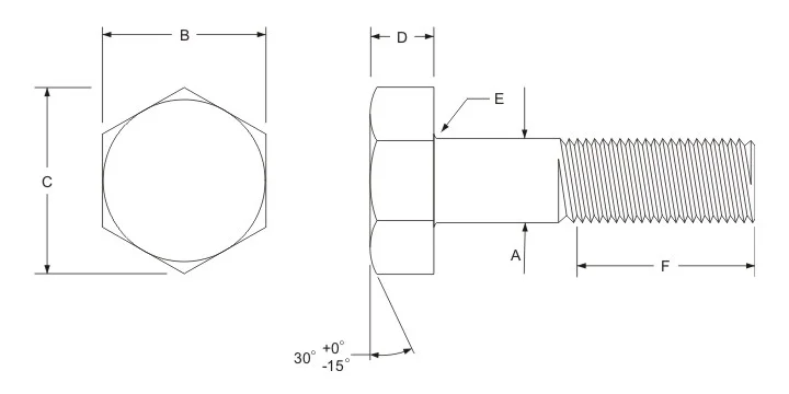 | Bolt Size | A (max) | B | C (min) | D | E | F Thread Length for Bolt Length |
